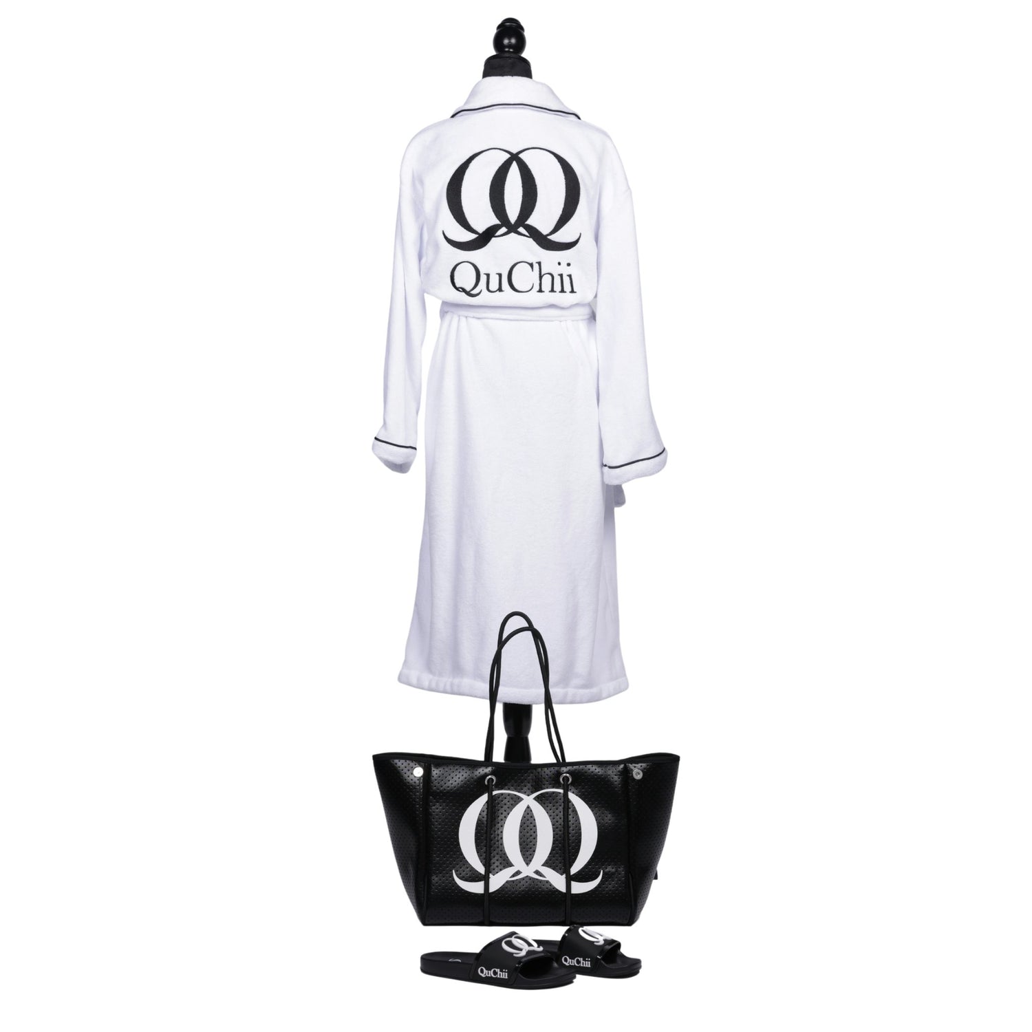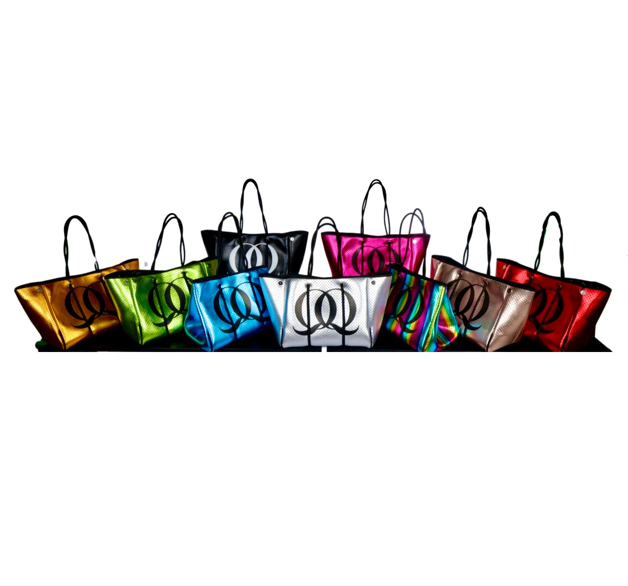 Embrace a contemporary look with our Modern Metallic Totes. Crafted in a sleek shade enhanced with chic black detailing of the QuChii logo on one side and the name on the other. These bags are both fashionable and versatile, allowing expansion for any occasion. The matching pouch included provides added convenience for organizing your essentials while on the go. The perforated design adorned with black letters adds a unique flair, making it a standout piece for any outfit.